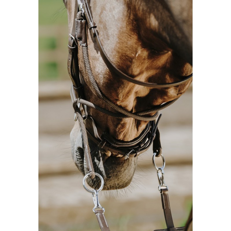 Bridon en cuir de buffle doublé vachette avec courroies en corde croisées.
