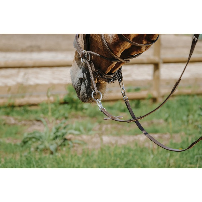 - Courroies en cordes croisées sous les ganaches du cheval, reliées aux rênes, passant dans des anneaux fixés