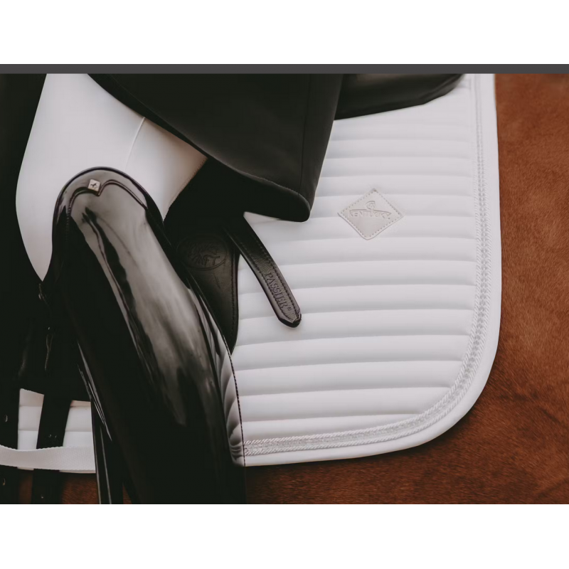 Ce tapis de selle a un matelassage horizontal unique et est fabriqué dans un matériau respirant (43% de nylon, 43% de polyester et 14% de spandex). Il comporte un logo en cuir subtil de la même couleur que le tapis, tout en offrant suffisamment d'espace pour le broder si nécessaire.