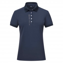 Polo à manches courtes * Élastique dans 4 directions * Séchage rapide * Col plat * Texte à strass sur le côté gauche de la poitrine, à côté de la patte avant * Motif à pois métalliques en forme de chevaux sur la manche gauche * Petit motif sur l’intérieur du col * Pressions métalliques sur l’avant au milieu