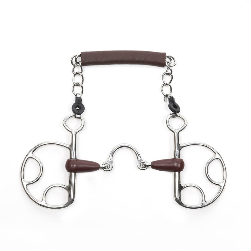 Mors espagnol Leather recouvert cuir avec une épaisseur d’embouchure de 17mm. Le système innovant Kimblewick de METALAB est conçu pour fournir aux cavaliers différentes options de levier, permettant de s’adapter facilement à une ou deux rênes. Conçu à la fois dans un souci de fonctionnalité mais aussi de confort, ce système garantit le bon positionnement des rênes, favorisant ainsi la stabilité et la confiance du cavalier. L’embouchure 3 pièces en demi lune crée un espace supplémentaire pour la langue, améliorant le confort et favorisant une meilleure communication entre le cheval et le cavalier. Conçu avec une forme ergonomique, les barres sont recouvertes d’un cuir souple de haute qualité, offrant une expérience plus agréable et confortable pour le cheval.