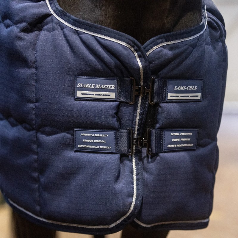 La Stable Master est une couverture d'écurie durable fabriquée à partir de tissu Polyester ripstop 1200D qui offre à la fois confort et durabilité. Elle est doublé de textile à base de charbon de bambou LAMI-CELL EnviroGreen®, un matériau écologique fabriqué à partir de fils recyclés et de textile de charbon de bambou naturel. La forme et le design innovants garantissent à la fois une liberté de mouvement et un ajustement ultime pour votre cheval. Un confort supplémentaire est assuré grâce à une protection de garrot en mouton synthétique. Le maintien de la couverture en place est assuré par une corde de queue amovible recouverte de PVC pour une hygiène optimale, des sursangles croisées et une double fermeture avec Velcro sur le devant.