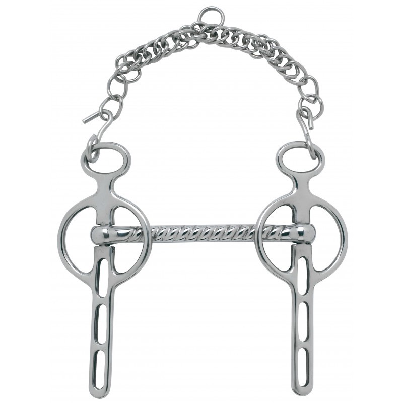 En inox à canon cintré 1/2 torsadé et branches fixes. 3 passants de rênes. Tailles 115 et 125 : branches à 2 trous. Tailles 135 à 165 : branches plus longues, à 3 trous.