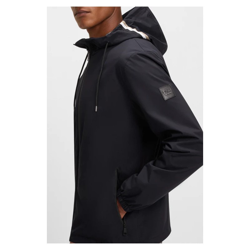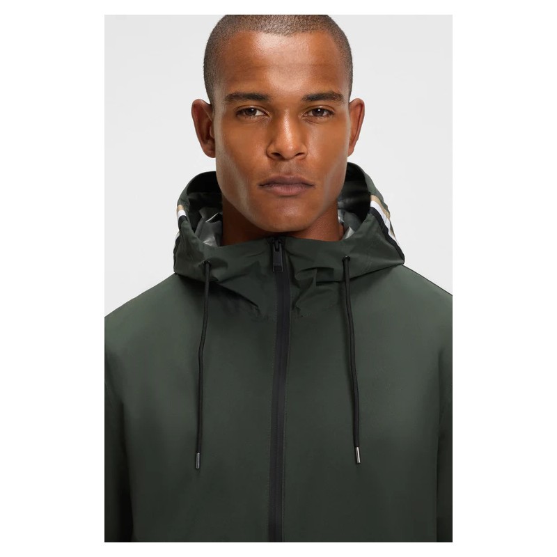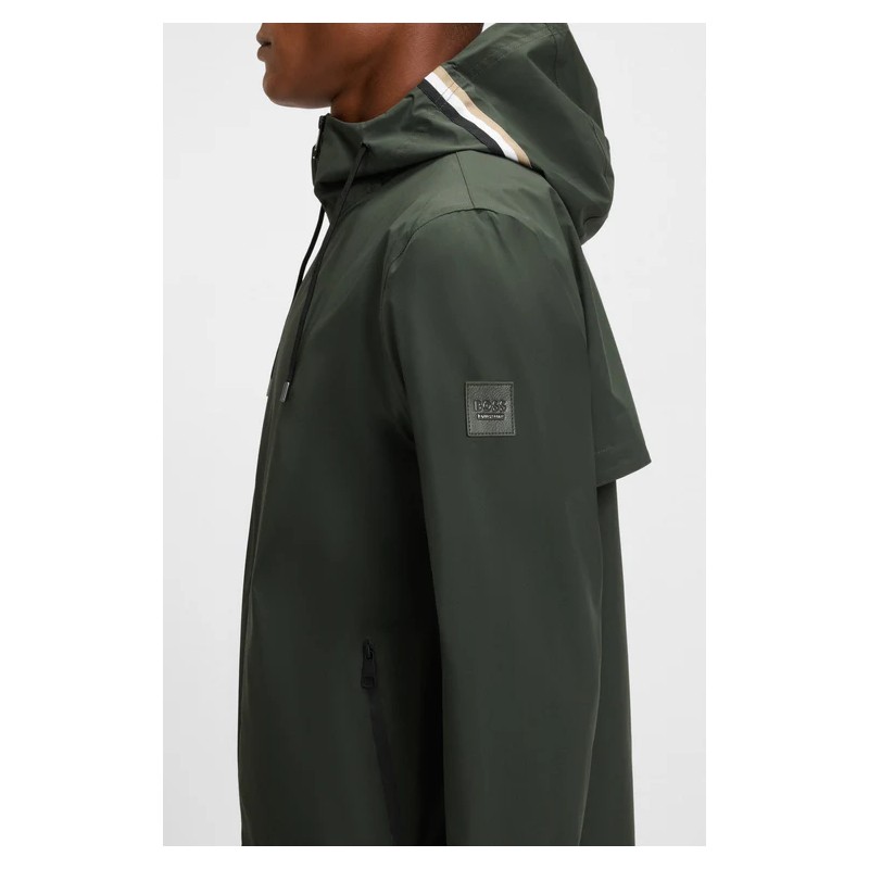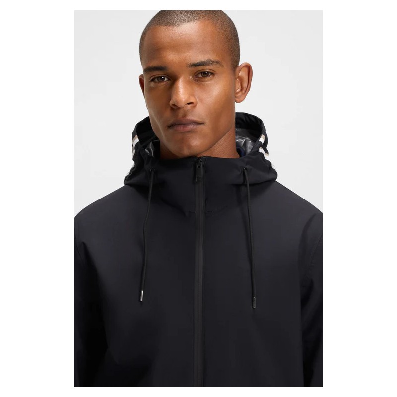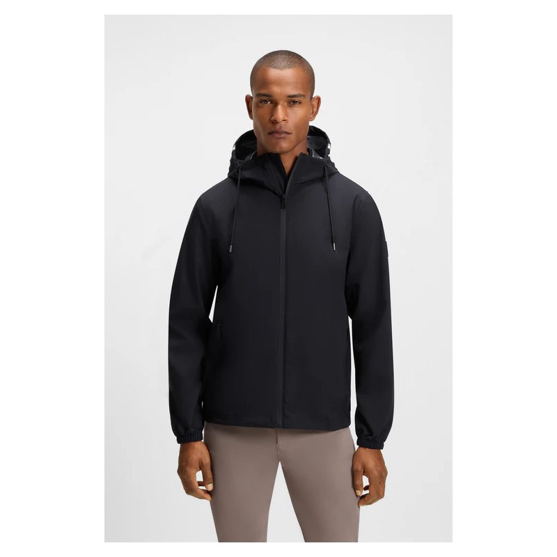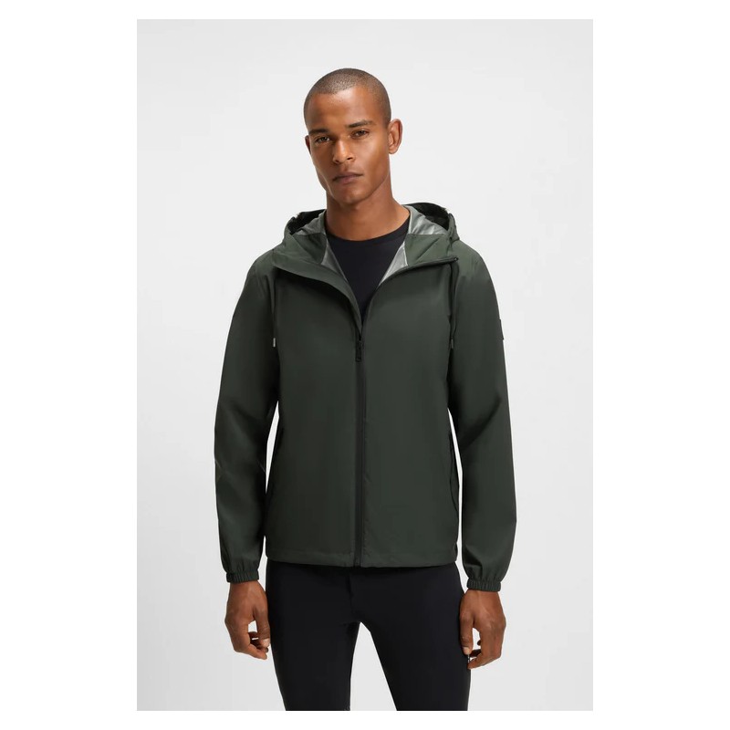 Veste imperméable, étanche, très élastique et respirante, avec un ruban adhésif signature autour de la capuche. Le capuche est réglable.