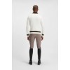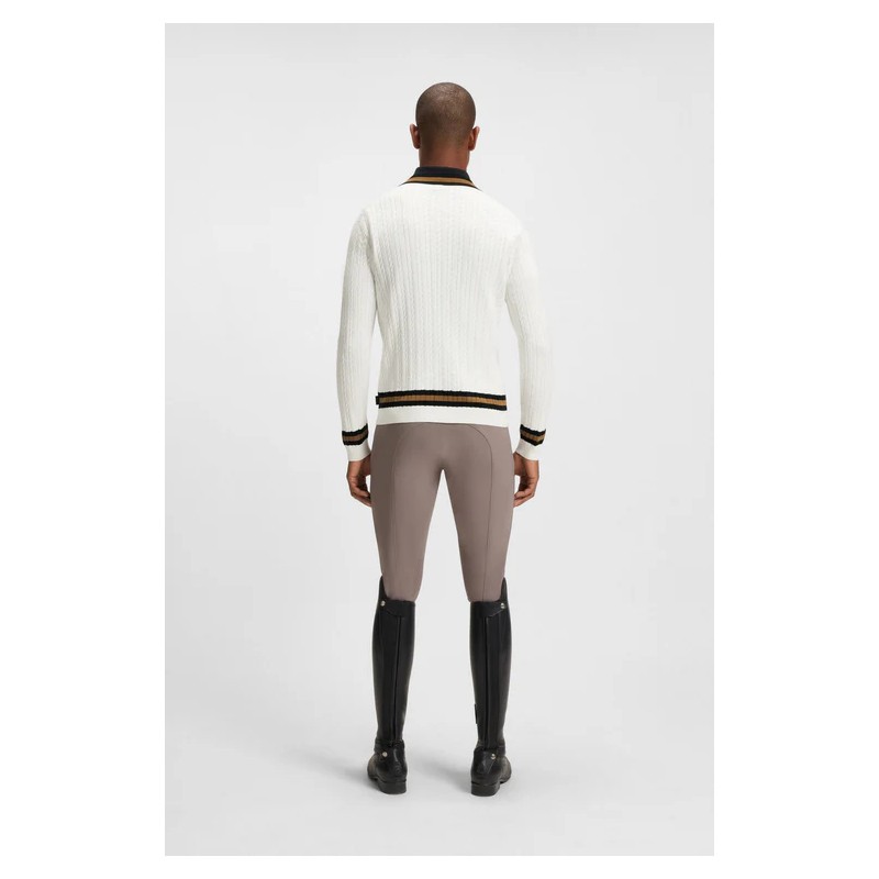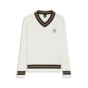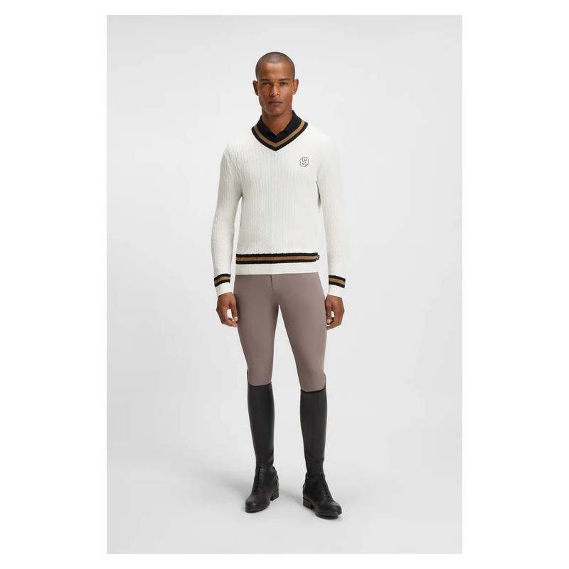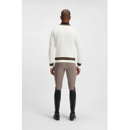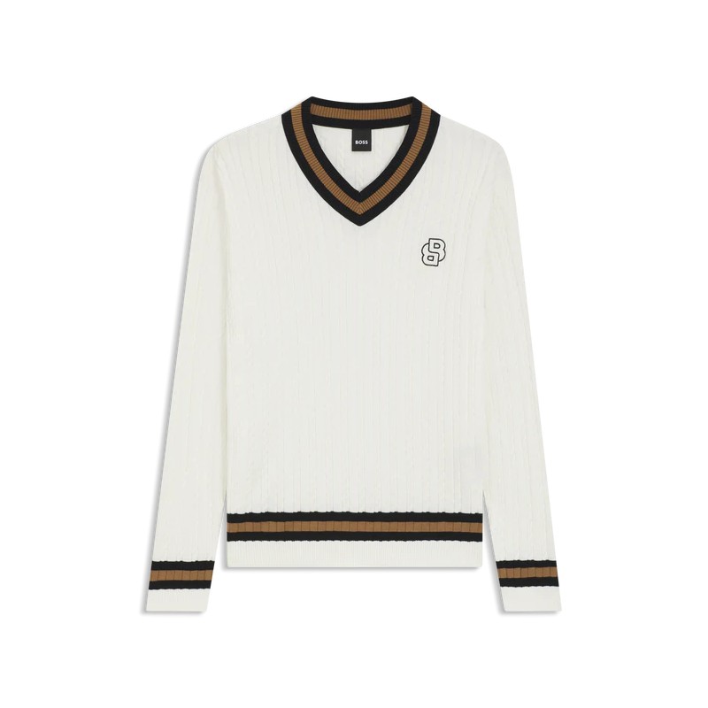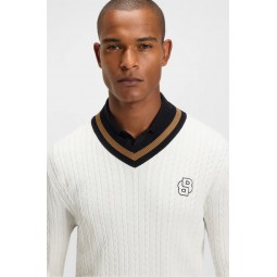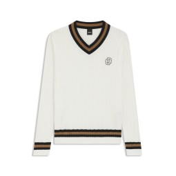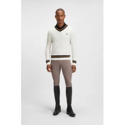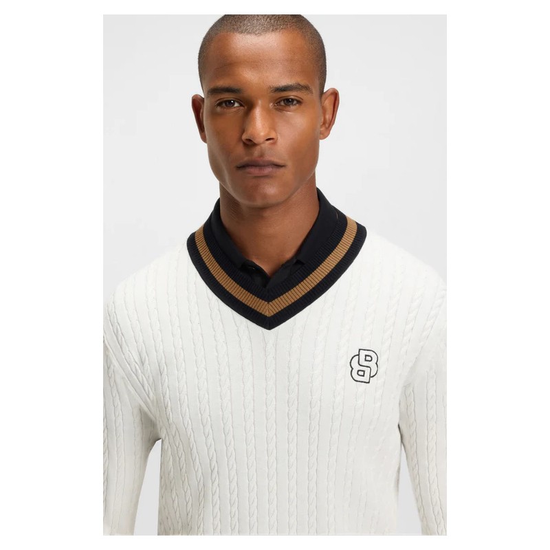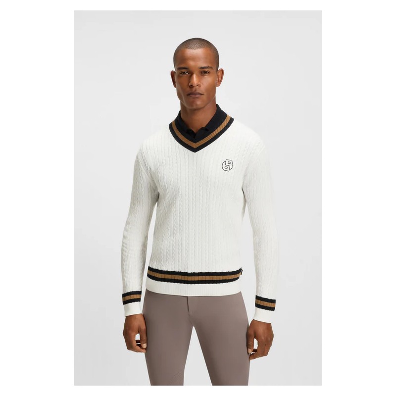 Pull tressé à plat, estivale avec col en V avec des rayures contrastantes ainsi que des rayures contrastantes sur les poignets et l’ourlet. Le pull porte une broderie du nouveau logo Double B en couleur contrastante sur la poitrine gauche et un petit drapeau équestre BOSS sur le côté droit. 100 % CO