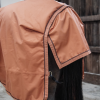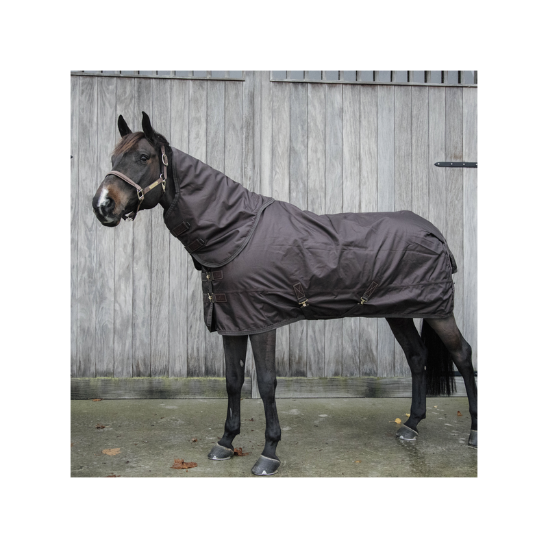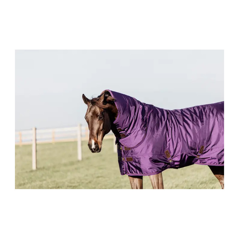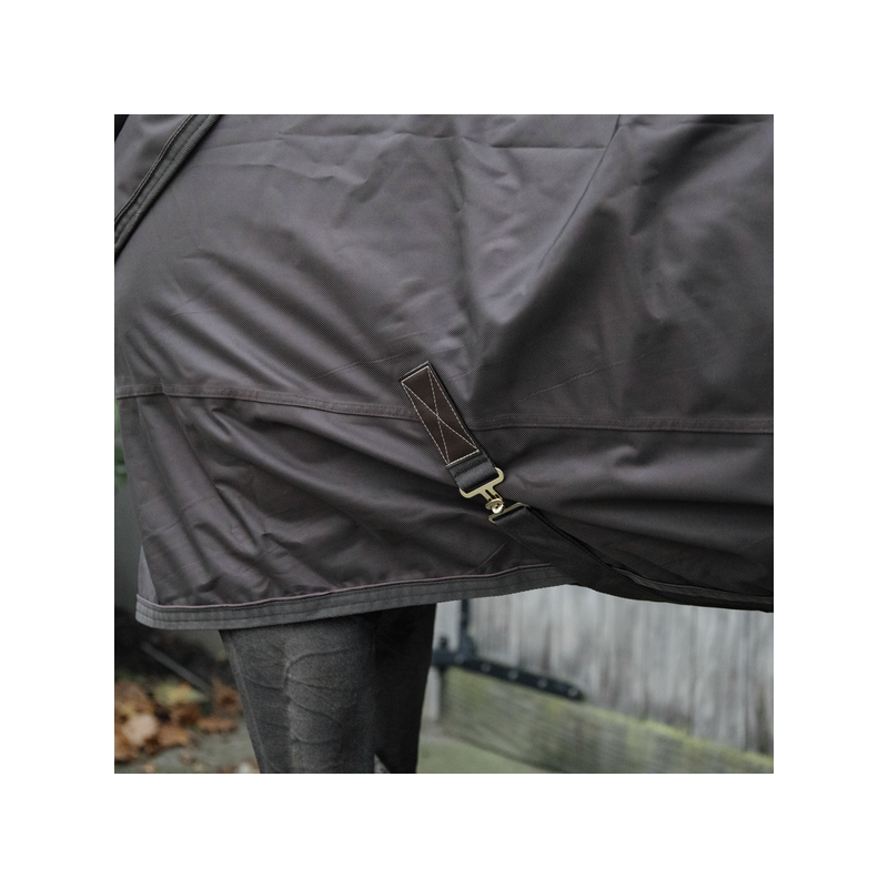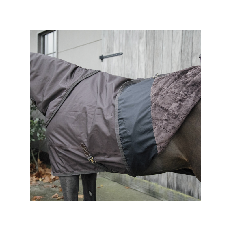 La couverture est de forme anatomique et ne comporte aucune couture sur le dos pour éviter les fuites. Grâce à la peau de lapin artificielle, la couverture se remet toujours à la bonne place après que le cheval se soit roulé. La couverture est équipée d'une fermeture autoaggripante avec 2 fermetures frontales, 2 sursangles croisées en tissu de ceinture de sécurité et une courroie de queue recouverte de plastique (pour un nettoyage facile). Pour plus de protection, il est possible d'acheter un couvre-cou séparé.