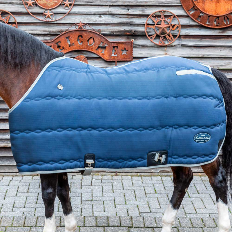 Couverture d'écurie Lamicell, modèle California, avec poitrail fermé, sangles croisées, passage de cuisse. nylon 1200D rip-stop, rembourage fiberfil 240gr. Couverture spécialement conçue pour les chevaux type "Quarter"